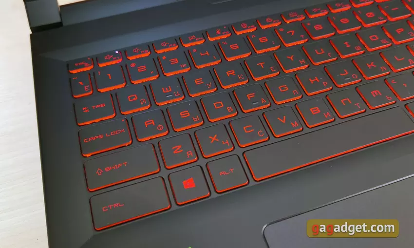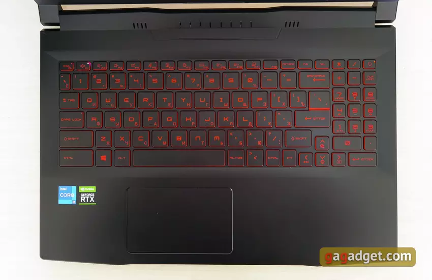 Das MSI Katana GF66 11UD hat eine Tastatur in voller Größe mit einem zusätzlichen Nummernblock, was bei 15,6-Zoll-Modellen nicht so üblich ist. Die Tastatur hat ihre eigenen Eigenschaften, aber alle am häufigsten verwendeten Tasten befinden sich an ihrem Platz, sodass Sie sich nicht lange daran gewöhnen müssen. Die obere Reihe der Funktionstasten ist in der Höhe leicht reduziert. Die linke Umschalt- und Strg-Taste sind etwas länger als die Standardtasten, die Eingabetaste ist einstöckig. Aufgrund des Vorhandenseins eines digitalen Blocks musste der Pfeilblock leicht nach links und damit nach rechts verschoben werden Schicht ist leicht verkürzt. Der Nummernblock selbst hat drei, nicht vier Spalten. Zusätzliche Eingabe wurde unter dem Block platziert und "+" und "-" - darüber.