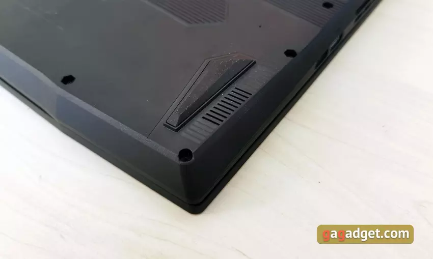 Auf der Unterseite des Laptops befinden sich Stereolautsprecher, vier breite gummierte Füße für Stabilität und eine Vielzahl von Belüftungsöffnungen, durch die kalte Luft eindringt. Sie sind in Form einer Art asymmetrischer Waben hergestellt.