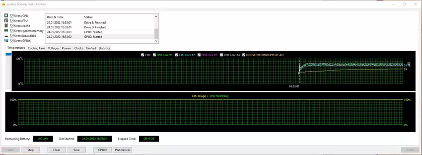 Cooler Boost 5 ist für die Kühlung des Laptops zuständig. enthält 2 Lüfter, 6 Heatpipes und ein unabhängiges Wärmemodul für CPU und GPU. Gleichzeitig werden Heatpipes mit dünneren Wänden verwendet, wodurch der Kanal im Inneren erweitert werden konnte. Das Kühlsystem bewältigt seine Aufgabe: Auch bei längerer Spitzenlast steigt die Temperatur der Komponenten im Inneren nicht über 80-83 °. Entsprechend wird keine Drosselung beobachtet. Der Bereich über der Tastatur erwärmt sich etwas, während der Rest der Arbeitsfläche kalt bleibt. Von der Lautstärke her ist das MSI Katana GF66 11UD ein typischer Gaming-Laptop. Ja, unter Last ist CO-Arbeit hörbar, aber in vertretbaren Grenzen.