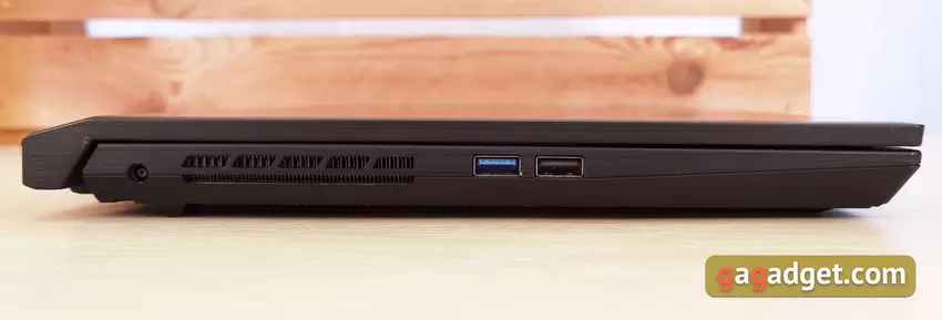 Auf der linken Seite des Laptops befinden sich Lüftungsschlitze, eine Buchse zum Anschließen eines Netzteils sowie USB 3.2 Gen1-Ports in voller Größe und USB 2.0:
