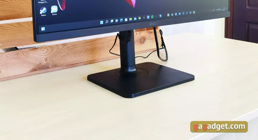 Der Standfuß ist sehr funktionell und ermöglicht eine flexible Einstellung der Position des Monitors. Es ist möglich, die Höhe mit einem Unterschied von bis zu 110 mm einzustellen. In der unteren Position berührt der Monitor praktisch den Standfuß: