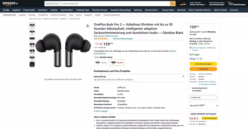 Die Rede ist von den OnePlus Buds Pro 2. Sie sind derzeit für check price on amazon im Angebot. Die Kopfhörer sind in zwei Farben erhältlich: Arbor Green und Obsidian Black.