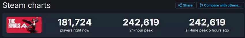 Laut SteamDB-Service hat die Online-Spitze von The Finals 242 Tausend Menschen überschritten und diese Zahl hat eine hohe Wachstumsrate.