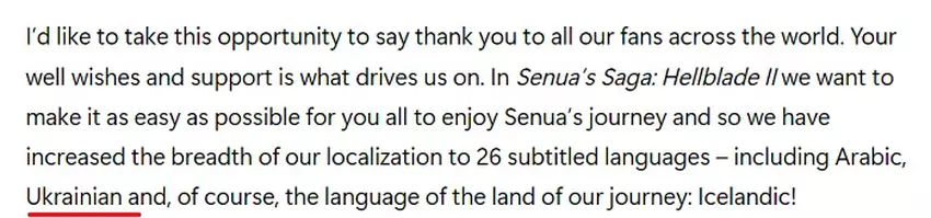 Der Leiter des Studios Ninja Theory, Dom Matthews, sagte in seiner Notiz auf der Xbox Wire-Website, dass das Spiel in 26 Sprachen, darunter auch Ukrainisch, verfügbar sein wird.