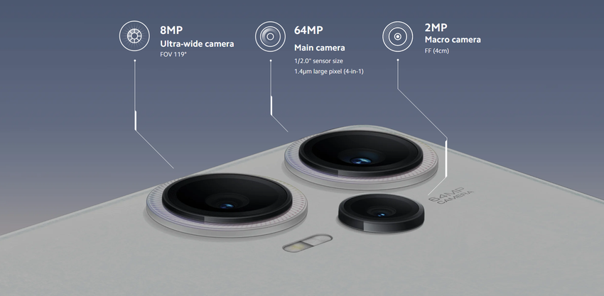 Die Auflösung der Hauptkamera beträgt 64 MP + 8 MP + 2 MP. Sie verfügt nicht über ein Teleobjektiv, hat aber eine optische und elektronische Bildstabilisierung. Sie können Videos in 4K UHD aufnehmen, aber die Bildrate ist auf 30 FPS begrenzt.