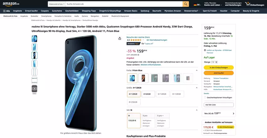 Es handelt sich um das realme 9i mit 4 GB RAM und 128 GB ROM. Das Smartphone debütierte 2022 und kostet jetzt check price on amazon.