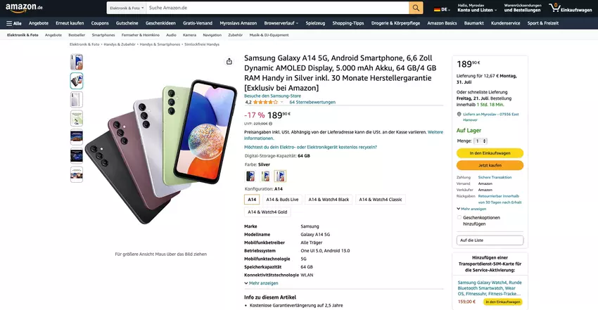 Die Rede ist von dem Modell Galaxy A14 5G. Das Smartphone kann nun in der Farbe Silber für 163,32 €, erworben werden. Andere Farben kosten ein bisschen mehr.