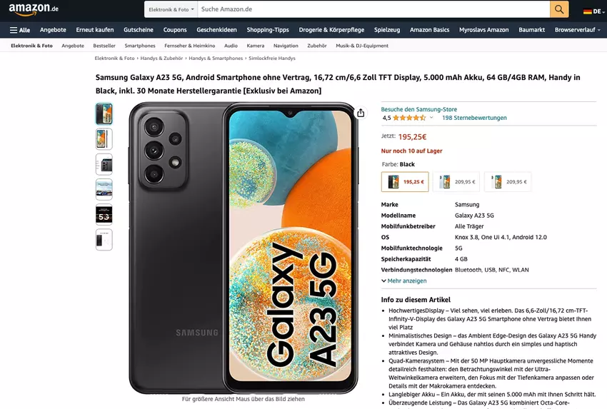 Es handelt sich um das Modell Galaxy A23 5G. Es wird zu einem vergünstigten Preis von 53,75 Euro verkauftcheck price on amazon).