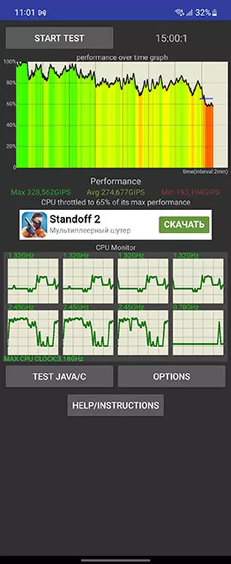 . Aber wie die letzte Generation hat auch das Samsung Galaxy Flip4 einige Probleme mit Überhitzung. In der Tat, angesichts der Design-Merkmale, ist es klar, dass das Layout sehr dicht ist und die Flaggschiff-Prozessoren sind immer heiß. Der CPU-Throttling-Test hat gezeigt, dass der Prozessor bei längerer maximaler Belastung zur Überhitzung neigt und die Leistung um bis zu 65 % sinkt. Auch das Gehäuse wird spürbar warm.