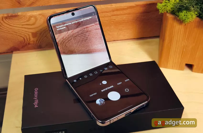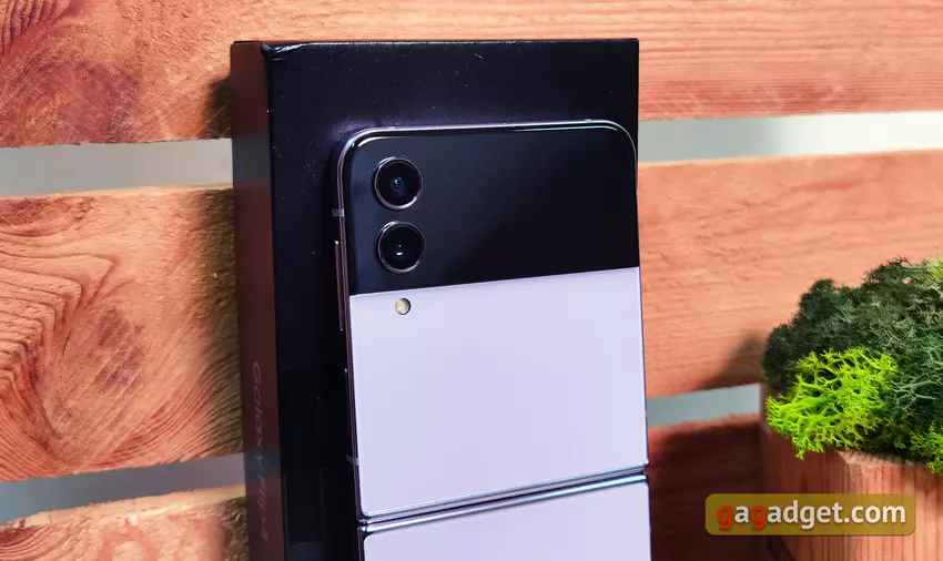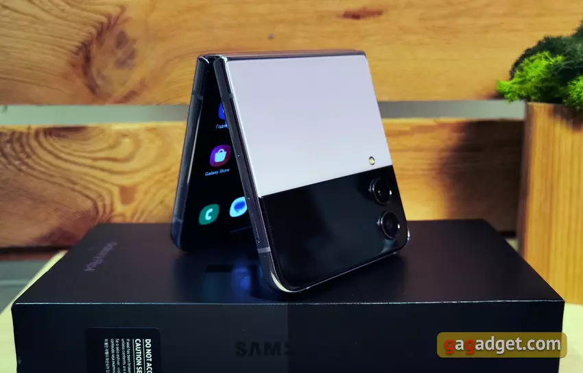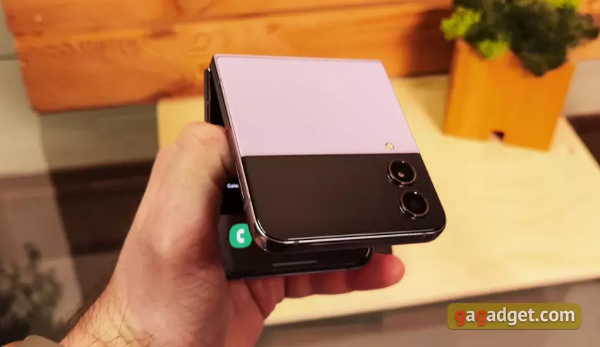 Das Design des Samsung Galaxy Flip4 ist im Wesentlichen unverändert geblieben, mit den bereits bekannten Vor- und Nachteilen. Es handelt sich um ein faltbares Tablet mit einem kleinen äußeren Hilfsbildschirm und einem großen flexiblen inneren Bildschirm. Im zusammengeklappten Zustand ist es ein kleines, aber recht dickes Quadrat, das sich bequem in fast jede Tasche stecken lässt. Alle Paneele sind aus Gorilla Victus+ Glas gefertigt. Sie sind in allen Farboptionen mattiert. Glänzender Metallrahmen, Scharnier und ein kleiner Bereich mit einem externen Display und der Haupt-Dual-Kamera. Der interne Bildschirm hat fast die üblichen länglichen Proportionen. Es ist schwer, das mit Sicherheit zu sagen, ohne das Flip3 zu haben. Aber es scheint so, als ob der Rahmen um den Umfang des Bildschirms und auch der Schutzrand etwas kleiner geworden sind. Ansonsten ist alles beim Alten: Über dem Display befindet sich ein Lautsprecher, im oberen Teil ist ein rundes Loch für die Frontkamera. In der Mitte des Displays befindet sich immer noch eine deutliche Falte. Leider ist es uns noch nicht gelungen, diesen zu beseitigen.