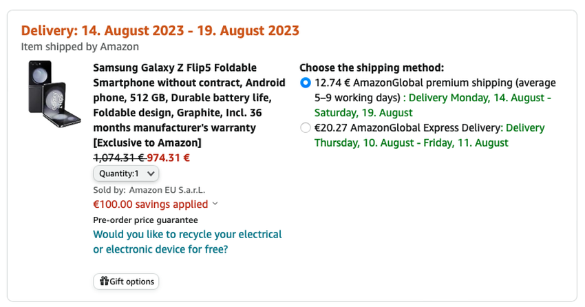 Es handelt sich um das Smartphone in der 512 GB Version. Das Gerät kostet zu einem Aktionspreis von 1.199,00 €. Der Verkäufer bietet auch einen Gutschein an. Somit kann das Smartphone günstiger als 1.000 € erworben werden. Es sind vier Farben verfügbar: Beige, Grau, Hellgrün und Hellrosa. Die ungefähre Lieferzeit beträgt 10-19 August.