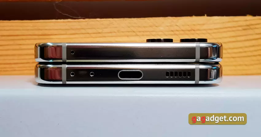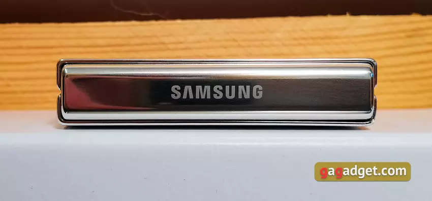 Der Rahmen besteht vollständig aus sogenanntem Armoured Aluminium. Es soll eine erhöhte Widerstandsfähigkeit gegen Stürze und Kratzer aufweisen. Rundherum befinden sich Kunststoffeinsätze für den stabilen Betrieb der Antennen. Das neue Flex-Hinge-Scharnier und die tropfenförmige Faltung des Bildschirms im zusammengeklappten Zustand ermöglichten es, die Lücke zwischen den beiden Hälften des Smartphones zu beseitigen. Dies hat nicht nur ästhetische, sondern auch praktische Vorteile. Es gelangt deutlich weniger Staub und Schmutz ins Innere, was die Wahrscheinlichkeit einer Beschädigung des Displays verringert. Die Lautstärke- und Einschalttasten mit dem Fingerscanner befinden sich an der gleichen Stelle wie zuvor. Sie liegen also etwas höher als bei herkömmlichen Smartphones und sind etwas gewöhnungsbedürftig.
