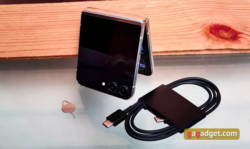 Keine Überraschungen, die Verpackung und Ausstattung des Samsung Galaxy Flip5 ist absolut typisch für alle Flaggschiffe des Unternehmens in den letzten Jahren. Eine kleine schwarze Schachtel mit einem stilisierten Bild eines Smartphones und dem Modellnamen. Darin befinden sich neben dem Samsung Galaxy Flip5 ein Kabel mit Type-C-Anschlüssen auf beiden Seiten (alte USB-Netzteile sind nicht geeignet), ein SIM-Karten-Auswurfwerkzeug und eine Dokumentation. Sie müssen also das Netzteil und die Schutzhüllen separat kaufen. Glücklicherweise hat Samsung immer ein sehr großes Angebot an zusätzlichem Zubehör.