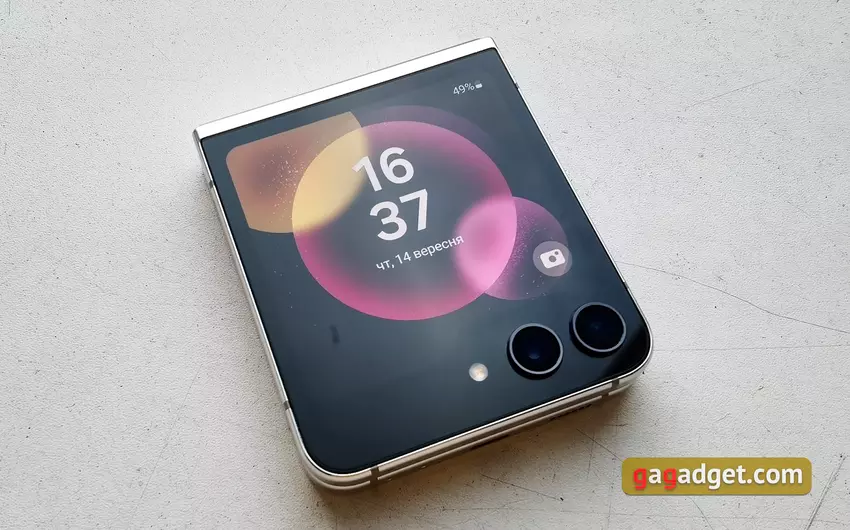 Das Samsung Galaxy Flip5 verwendet ein 3,4 Zoll großes externes Super AMOLED-Display mit einer Auflösung von 720x748 (306 PPI). Es nimmt den größten Teil der Oberfläche des Panels ein. Das Display hat eine hohe Bildqualität, eine gute Helligkeit und verblasst nicht in der Sonne. Aber es gibt einen weniger angenehmen Moment: Die Bildwiederholfrequenz beträgt 60 Hz. Und wenn man zwischen dem 120-Hz-Hauptbildschirm und dem externen 60-Hz-Bildschirm umschaltet, scheint es, dass das Bild auf dem letzteren etwas langsamer ist.