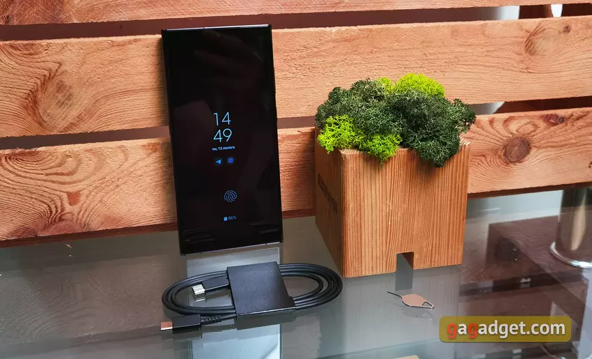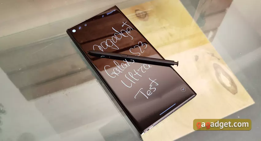 Die Anordnung der Elemente an den Rändern bleibt unverändert. Oben befindet sich ein einzelnes Mikrofon. An der Unterseite befinden sich der externe Hauptlautsprecher , der USB-Typ-C-Anschluss, zwei Mikrofone (die vorherige Generation hatte eines), eine Ablage und ein S Pen. Wie im letzten Jahr befindet er sich auf der linken Seite, sodass er bequem entfernt werden kann, wenn man das Smartphone mit der rechten Hand hält. Wie Sie sehen können, ist die Form des Smartphones rechteckiger geworden. Leider gibt es derzeit keine Möglichkeit, es mit dem Samsung Galaxy S23 Ultra zu vergleichen und zu sagen, welche Form komfortabler ist.