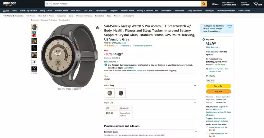 Die Samsung Galaxy Watch 5 Pro mit 45-mm-Gehäuse, LTE und Wear OS an Bord ist bei Amazon für 50 Dollar weniger erhältlich.