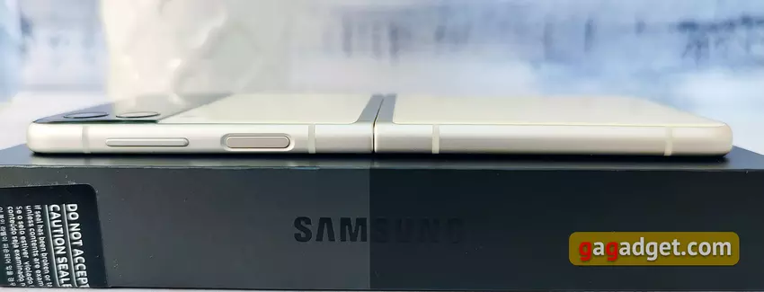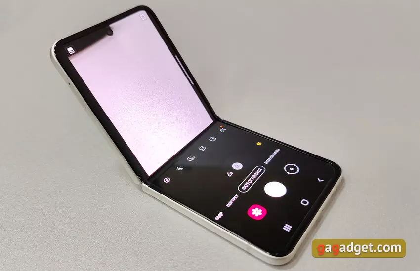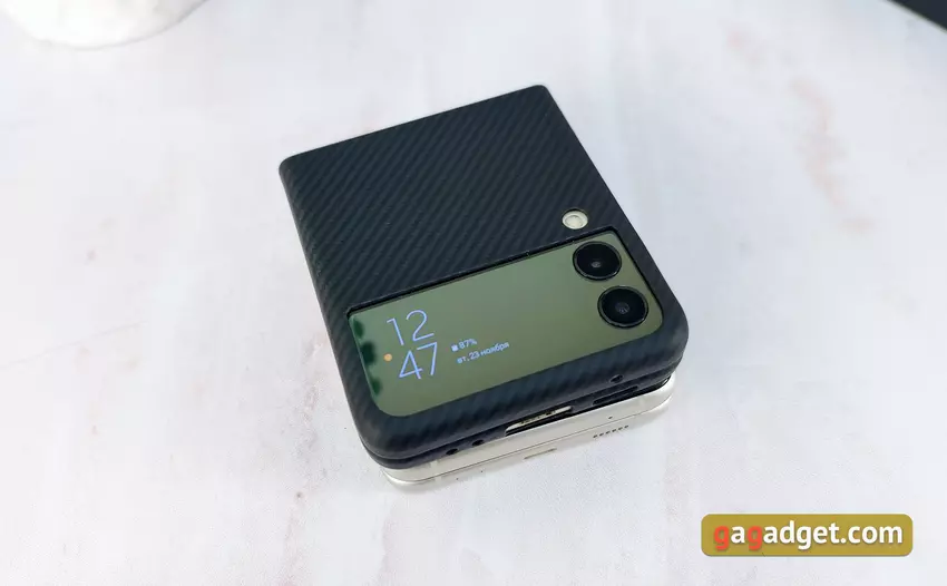 Dank seiner geringen Längsmaße im gefalteten Zustand passt das Samsung Galaxy Z Flip3 perfekt in die Tasche fast jeder Jeans. Dagegen gefällt die erhöhte Dicke etwas weniger. Ein weiteres Feature, das vom ersten Modell übernommen wurde, ist, dass sich das Smartphone nur schwer mit einer Hand öffnen lässt. Das ist ganz real, aber ich habe es nicht geschafft, die entsprechende "Technik" zu entwickeln. Offenbar wirkt sich das Fehlen von Tastentelefonen bei der Verwendung von Clamshells aus. Was bietet dieses Design neben dem Wow-Effekt und der Kompaktheit? Für den Anfang wird in halb gefalteter Form eine Art „Ständer“ zum Aufnehmen sowohl auf der Haupt- als auch auf der Frontkamera erhalten. Ja, und für Videoanrufe nützlich.