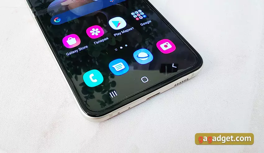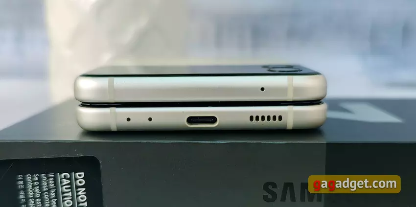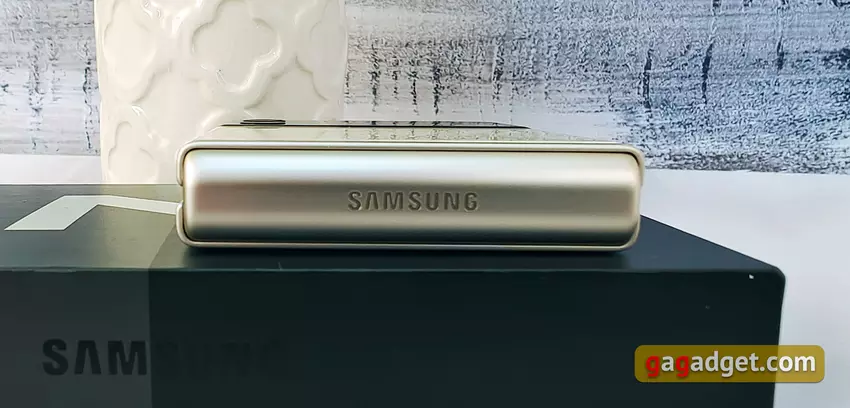 Im geschlossenen Zustand sieht das Samsung Galaxy Z Flip3 aus wie ein kleiner quadratischer Balken mit einer ziemlich beeindruckenden Dicke. Die Frontplatte ist in zwei Teile geteilt, die mit Glas bedeckt sind. Die Unterseite ist schwarz mit einem externen Bildschirm und einer Doppelkamera, oben ist der Hauptteil des Panels mit einem Blitz. In unserem Fall ist es beige, aber das Smartphone ist auch in mattem Schwarz, Grün und Lila erhältlich. Der externe Bildschirm wurde deutlich vergrößert, wodurch er viel komfortabler zu bedienen ist. Wir werden später darauf zurückkommen. Im geöffneten Zustand Das Galaxy Z Flip3 sieht aus und fühlt sich fast wie ein normales Smartphone mit einem leicht verlängerten Bildschirm an. Die Ränder um den Umfang sind immer noch etwas breiter als bei "normalen" Smartphones. Die Frontkamera befindet sich in einem runden Ausschnitt, und über dem Bildschirm befinden sich drei Steckplätze des Lautsprechers, der sowohl für Gespräche als auch für Stereoton verwendet wird.