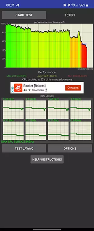 Das Samsung Galaxy Z Flip 3 hat, wie die meisten Smartphones mit Snapdragon 888, Probleme mit Überhitzung: Im Stresstest sinkt die Leistung allmählich auf etwa 80 % und bleibt für etwa 10 Minuten auf diesem Niveau. Dann beginnt der zweite Sturz. Am Ende des Tests bis zu 50 %. Das Smartphone erwärmt sich spürbar. Gleichzeitig werden solche Probleme im wirklichen Leben selbst in schweren Spielen nicht beobachtet.