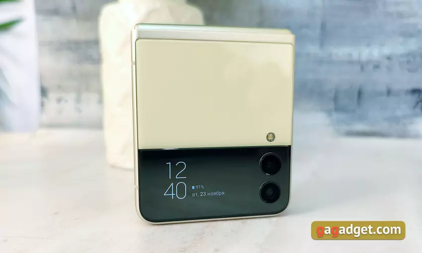 Eines der Hauptprobleme beim ersten Galaxy Z Flip war der unbrauchbare externe Bildschirm. Beim neuen Galaxy Z Flip3 wurde dieser Punkt korrigiert. Die Diagonale beträgt 1,9 Zoll. Mit ihr lassen sich Selfies auf der Hauptkamera aufnehmen, während die Modi und Kameras durch Wischen umgeschaltet werden. Und es ist wirklich bequem. Außerdem gibt es Widgets. Mit ihrer Hilfe können Sie schnell auf einige nützliche Funktionen zugreifen, ohne Ihr Smartphone öffnen zu müssen. Nun, seine offensichtlichste Anwendung ist Always on Display mit einer Uhr, Benachrichtigungen und anderen Dingen.