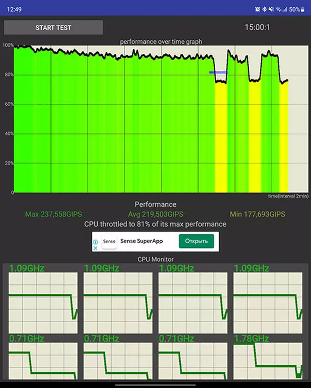 Auf dem Samsung Galaxy Z Fold3 ist das traditionelle, proprietäre Dienstprogramm Game Center mit einer Reihe von installierten Spielen und Game Booster-Add-ons vorinstalliert. Es gibt die üblichen Einstellungen für solche Dienstprogramme, um die Leistung zu erhöhen, Benachrichtigungen abzuschalten, die Helligkeit zu blockieren usw. Sowie herunterladbares Material. Am nützlichsten ist wahrscheinlich Z Pref. Es ist verantwortlich für die Überwachung der GPU-Last, Temperatur und FPS in Echtzeit. Was die Spiele selbst betrifft, so zeigt Call of Duty Mobile bei maximalen Grafikeinstellungen fast immer 60 fps, NFS No Limits zeigt 60 fps, und Shadowgun Legends läuft meist mit leichten Schwankungen mit etwa 100 fps.