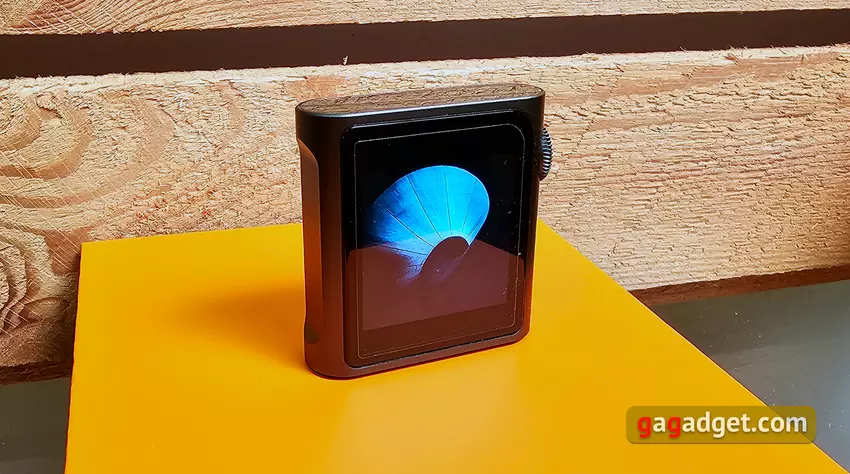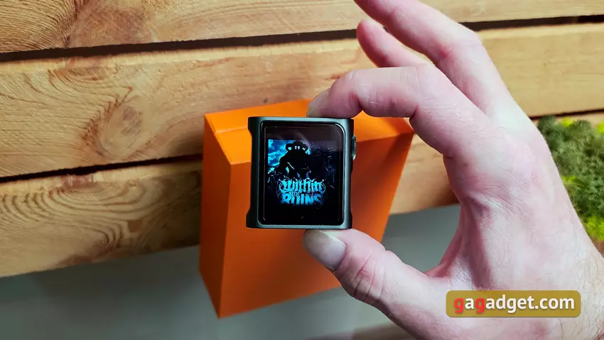 Die Vorderseite hat ein schwarzes Schutzglas mit abgerundeten Kanten und ein 1,54-Zoll-Touchscreen-Display mit einer Auflösung von 240x240. Es ist zwar klein, reicht aber aus, um die wichtigsten Funktionen des Players zu steuern.