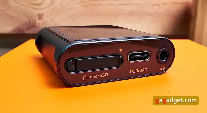 Die Unterseite hat einen Typ-C-Anschluss zum Aufladen und zum Anschluss an einen PC oder ein Smartphone als USB-DAC, einen microSD-Kartensteckplatz (der Player hat keinen eingebauten Speicher) und einen ungewöhnlichen 3,5-mm-Kopfhöreranschluss. Er kann sowohl im Standard- als auch im symmetrischen Modus betrieben werden. Zu diesem Zweck müssen Sie jedoch einen proprietären Pentaconn-Adapter von 3,5 mm auf 4,4 mm mit symmetrischem Anschluss separat kaufen. Leider hat das Unternehmen beschlossen, ihn nicht mit dem Player zu bündeln, sondern separat zu verkaufen.