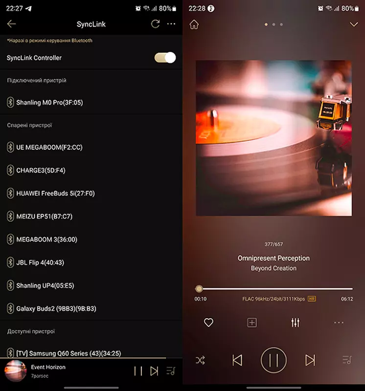 Wenn ein Smartphone als Quelle verwendet wird, kann die Wiedergabe sowohl vom Player als auch vom Smartphone aus gesteuert werden. Und dank der proprietären Eddict Player-App und der SyncLink-Unterstützung können Sie die Musikwiedergabe von einer Speicherkarte im Player über Ihr Smartphone steuern.