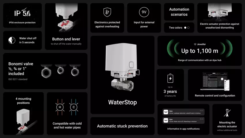 WaterStop ist ein ferngesteuertes Wasserabsperrventil. Das System schafft einen vollautomatischen Überflutungsschutz. WaterStop besteht aus einem Wasserhahn und einem leistungsstarken Elektroantrieb. Das System kann das Wasser automatisch über die Ajax-App oder durch Drücken einer Taste am Gerät abstellen. WaterStop basiert auf der proprietären Jeweller-Technologie (dem wichtigsten drahtlosen Datenübertragungsprotokoll, das von Ajax Systems verwendet wird). Es ermöglicht die Kommunikation über eine Entfernung von bis zu 1.100 Metern und ist durch Verschlüsselung geschützt.