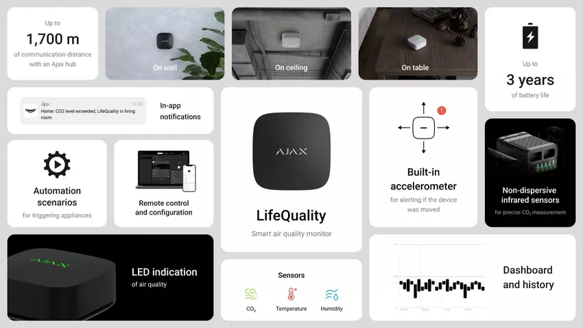 LifeQuality ist ein professioneller Sensor zur Überwachung der Luftqualität in Innenräumen, der Temperatur, Feuchtigkeit und CO2 misst. Der Sensor ist mit Schweizer und schwedischen Sensoren ausgestattet, die in medizinischen Geräten verwendet werden, so dass die Daten so genau wie möglich sind. Der Vorteil des Detektors ist die Möglichkeit, alle Indikatoren über die Ajax-App zu verfolgen. Sie können die aktuellen Messwerte oder den Verlauf für mehrere Tage, eine Woche, einen Monat und sogar ein Jahr anzeigen. Das hilft, die Dynamik der Luftqualität zu verstehen.