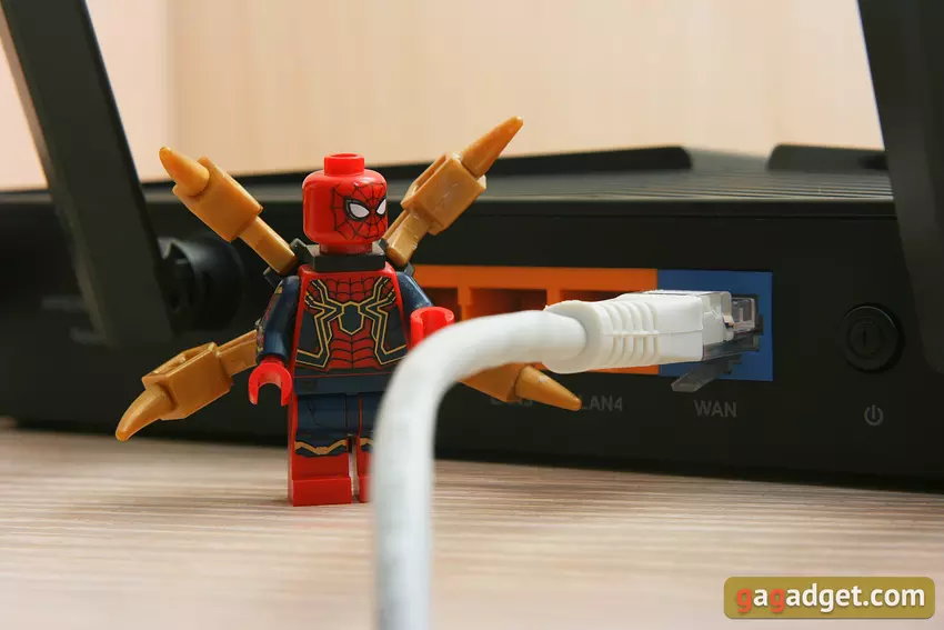 An den Seitenflächen gibt es keine wesentlichen Elemente, sie konzentrieren sich alle auf die Rückwand. Alle vier Antennen sind hier angebracht, auch RJ-45-Ports sind hier montiert: blau für eingehende Verbindungen (WAN) plus vier orange für den Anschluss von kabelgebundenen Clients (LAN). Für WPS ist eine separate Taste vorgesehen, die bei langem Drücken die drahtlosen Schnittstellen ein- und ausschaltet. Der Reset versteckt sich in der Aussparung unter der Büroklammer, und der Strom kann ein- oder ausgeschaltet werden, ohne das Kabel zu ziehen, zum Glück gibt es auch dafür einen Knopf. Klassische, praktische und bewährte Steuerungsgruppe.