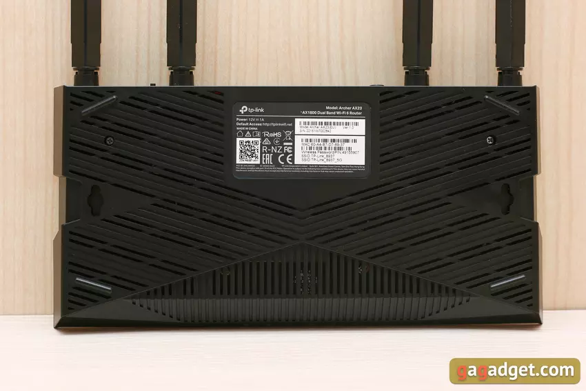 Der untere Teil hat viele Lüftungsschlitze, es gibt Füße für Stabilität auf der Oberfläche und Löcher für die Wandmontage, was praktisch ist. An der üblichen Stelle finden Sie einen Aufkleber mit grundlegenden Informationen zum Verbinden mit dem Router.