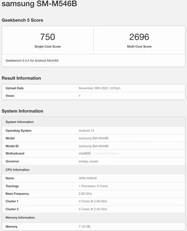 Das Gerät trägt die Modellnummer SM-M546B. Laut den Dokumenten wird das Smartphone mit dem Prozessor s5e8835 laufen. Vermutlich könnte es sich dabei um den neuen Exynos 1380 Chip handeln, obwohl es zuvor hieß, dass die Neuheit einen Snapdragon 888 SoC erhalten wird. Außerdem soll das Gerät mit 8 GB RAM und dem Betriebssystem Android 13 ausgestattet sein.