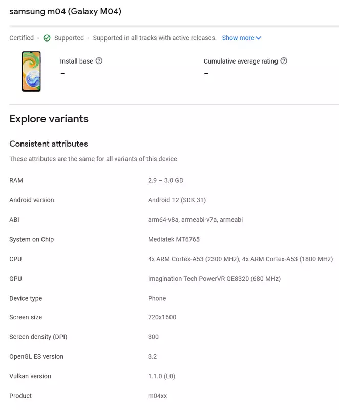 Es handelt sich um das Modell Galaxy M04. Das Smartphone ist in der Datenbank der Google Play Console aufgetaucht. Laut dem Leak wird das Gerät mit einem Octa-Core MediaTek Helio G35 Prozessor und 3 GB RAM ausgestattet sein.