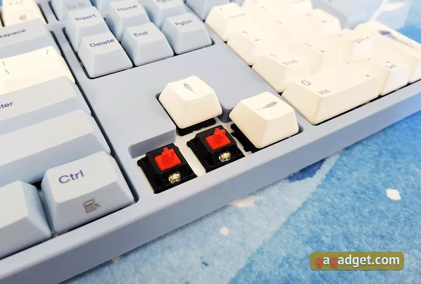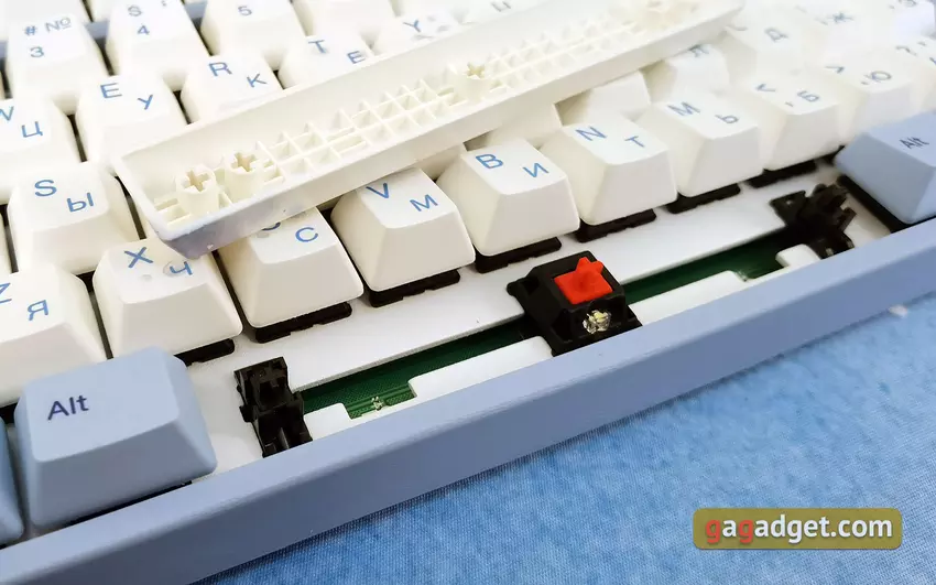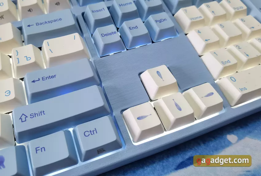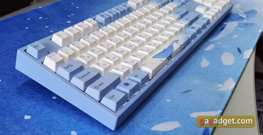 Die Tastatur hat ein Standardlayout. Es ist so, wie es sein sollte: F1 befindet sich über der Taste 2, die Umschalt- und die Rücktaste sind lang, die Eingabetaste ist einseitig belegt. Man braucht sich also nicht daran zu gewöhnen: Alles ist Standard und bequem. Die Tastatur unterstützt N-Key-Roll-Over (NKRO), so dass eine beliebige Anzahl gleichzeitig gedrückter Tasten ausgelöst wird. Alle Symbole und Zeichnungen auf den Tasten werden im Thermosublimationsdruck aufgebracht, sie sind sehr haltbar und färben mit der Zeit nicht ab. Das kyrillische Alphabet ist vorhanden, aber leider gibt es keine ukrainischen Symbole. Dies ist jedoch kein kritisches Problem.