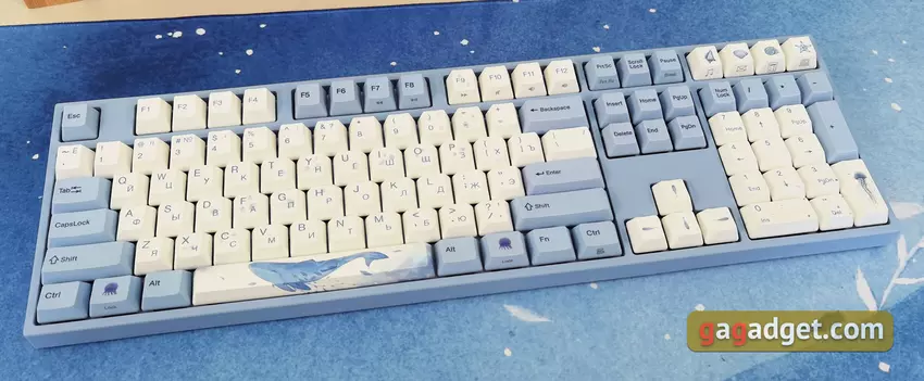 Die Tastatur hat keine weiteren Zusatzfunktionen. Daher ist es nicht erforderlich, eine zusätzliche Anwendung zu installieren. Einfach an einen USB-Anschluss anschließen und verwenden. Zusammen mit der Tastatur erhielten wir die Varmilo Sea Melody Desk Mat XL Oberfläche, die das gleiche Design wie die Tastatur hat. Die blau-weiße Farbgebung und das Bild eines Wals. XL ist die größte Variante und nimmt den meisten Platz aller Standard-Bürotische ein. Seine Abmessungen sind 900x400mm und 3mm dick. Es gibt auch kleinere Versionen.