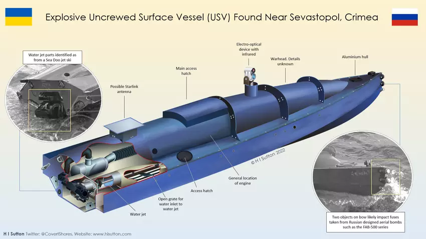 Vor dem Angriff auf die Schwarzmeerflotte war bereits eine unbekannte Unterwasser-Kamikaze-Drohne vor der Küste der vorübergehend besetzten Krim gesichtet worden. Sie war mit Kameras ausgestattet, hatte eine Reichweite von etwa 100 km und konnte eine Geschwindigkeit von über 70 km/h erreichen.