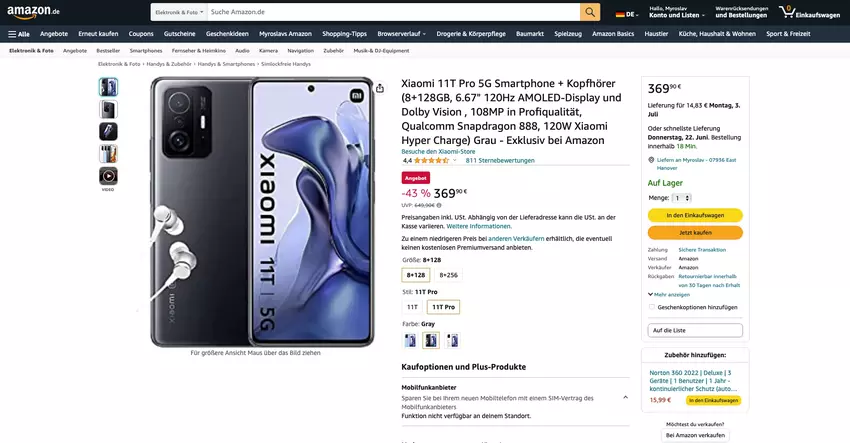 Es handelt sich um das Xiaomi 11T Pro in einer 8/128GB Variante. Der Preis des Smartphones liegt bei check price on amazon.