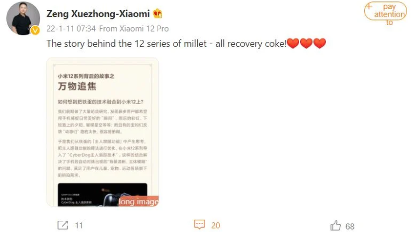 Zeng Xiuzhun, Senior Vice President von Xiaomi, erinnerte sich plötzlich an die vor anderthalb Monaten angekündigten Xiaomi 12 Smartphones. Wie sich herausstellte, wanderte einer der CyberDog-Chips in ihre Zelle. Die Rede ist vom automatischen Fokussiersystem CyberFocus.