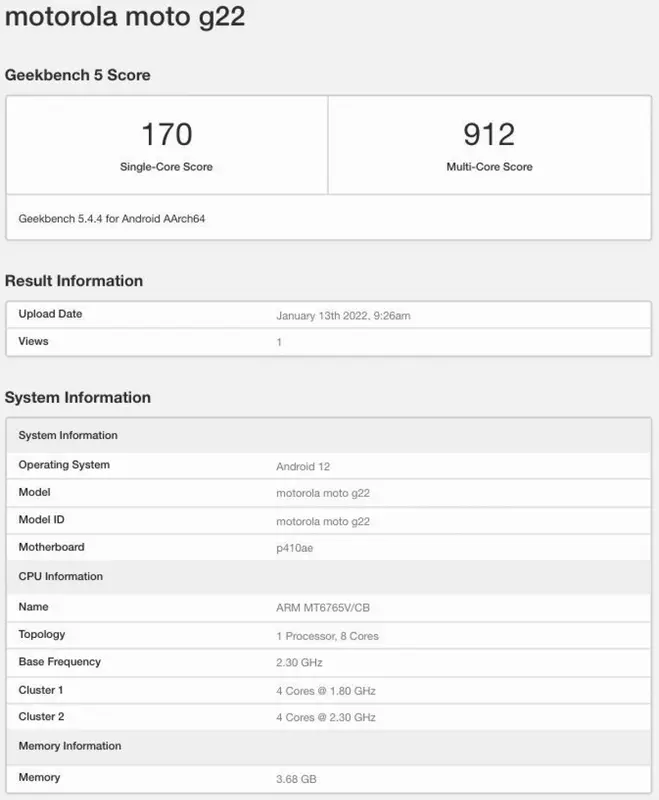 Die Rede ist vom Modell Moto G22. Die Neuheit wurde in der Leistungstestdatenbank von Geekbench bemerkt. Den Unterlagen zufolge wird das Gerät von einem alten MediaTek Helio P35 Octa-Core-Prozessor angetrieben. Außerdem erhält das Gerät nur 4 GB RAM.