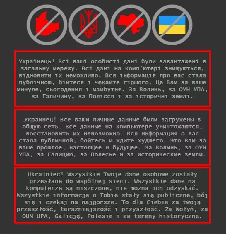 Unbekannte Hacker hinterließen auf den Seiten der Abteilungen eine Nachricht auf Ukrainisch, Russisch und Polnisch, deren Inhalt im Screenshot unten zu finden ist.