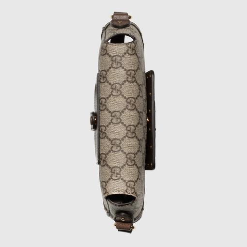 Der Koffer ist Teil der Ophidia-Taschenlinie, die bereits 2018 auf den Markt kam. Die Neuheit verbindet Vintage und modernen Stil. Hergestellt aus GG Supreme-Canvas, das zu 100 % recycelbar ist. Er erhielt auch Beilagen braunes Leder u Futter aus Neopren und Viskose.