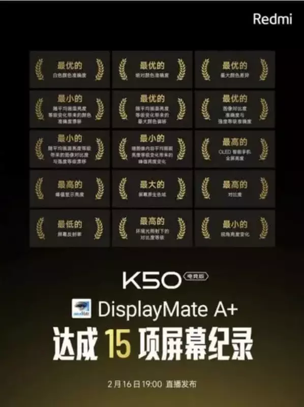 Ein neues Poster verrät, dass das Redmi K50 Gaming Edition 15 Rekorde gebrochen hat: DisplayMate hat dem Gerät die Bewertung A+ verliehen. So wird berichtet, dass das Display des Smartphones unter allen Smartphones das höchste Maß an Kontrast, Weißabgleich und Farbgenauigkeit aufweist. Das sagt auch der Bericht