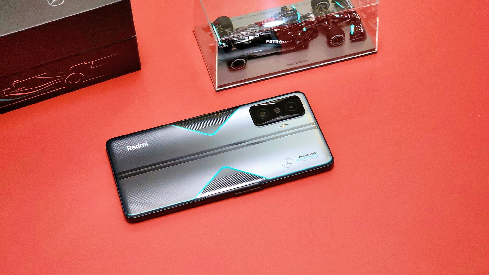 Zusammen mit Redmi K50 Gaming-Edition in China wurde eine limitierte Version in den Farben des Mercedes-Benz AMG Petronas F1 Teams präsentiert.