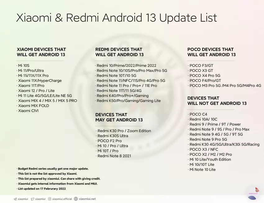 Google hat kürzlich einen Entwickler-Build des Betriebssystems veröffentlicht Android 13, und xiaomiui hat eine Liste von Xiaomi-Smartphones vorbereitet, die eine neue Version des Betriebssystems erhalten werden.