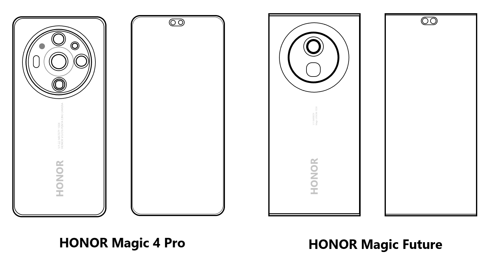 Die Skizzen zeigen vier Modelle: Magic 4T, Honor Magic 4, Magic 4 Pro und Magic Future. Die letzten drei Smartphones werden mit einer Dual-Frontkamera ausgestattet sein. Die Pro+-Version war nicht auf dieser Liste.