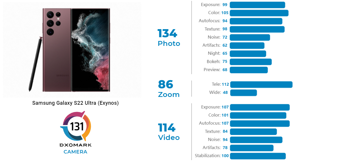 Leider hat es das Galaxy S22 Ultra trotz seines Preises nicht unter die Top Ten der besten Kamerahandys geschafft. Seine durchschnittliche Punktzahl lag bei 131: 134 für Foto, 86 für Zoom und 114 für Video.