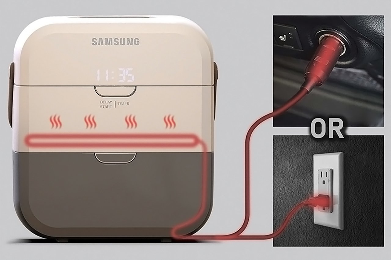 Der tragbare Ofen hat ein einfaches Design mit einer flachen Oberfläche und dem ikonischen Knopf, der wie eine Pille aussieht. Es ist in zwei Abschnitte unterteilt: oben und unten. Der obere Heizbehälter eignet sich perfekt zum Kochen oder Warmhalten, während der untere Behälter zum Aufbewahren von Obst oder Desserts verwendet werden kann.