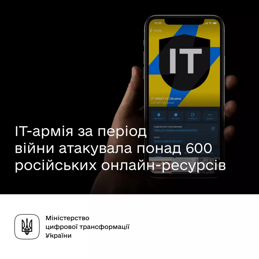 Seit Beginn der russischen Aggression in der Ukraine hat das Ministerium für digitale Entwicklung eine IT-Armee geschaffen, der ukrainische und ausländische IT-Spezialisten beigetreten sind. Seitdem ist es dem Team gelungen, mehr als 600 russische Online-Ressourcen anzugreifen.