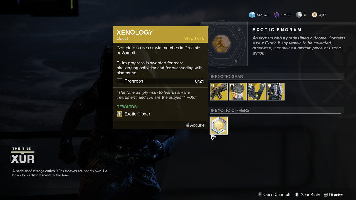 Diese Woche möchte Xur, dass du 21 Strikes abschließt oder Crucible- oder Gambit-Matches gewinnst. Sie erhalten eine exotische Chiffre, wenn Sie die Quest abschließen.